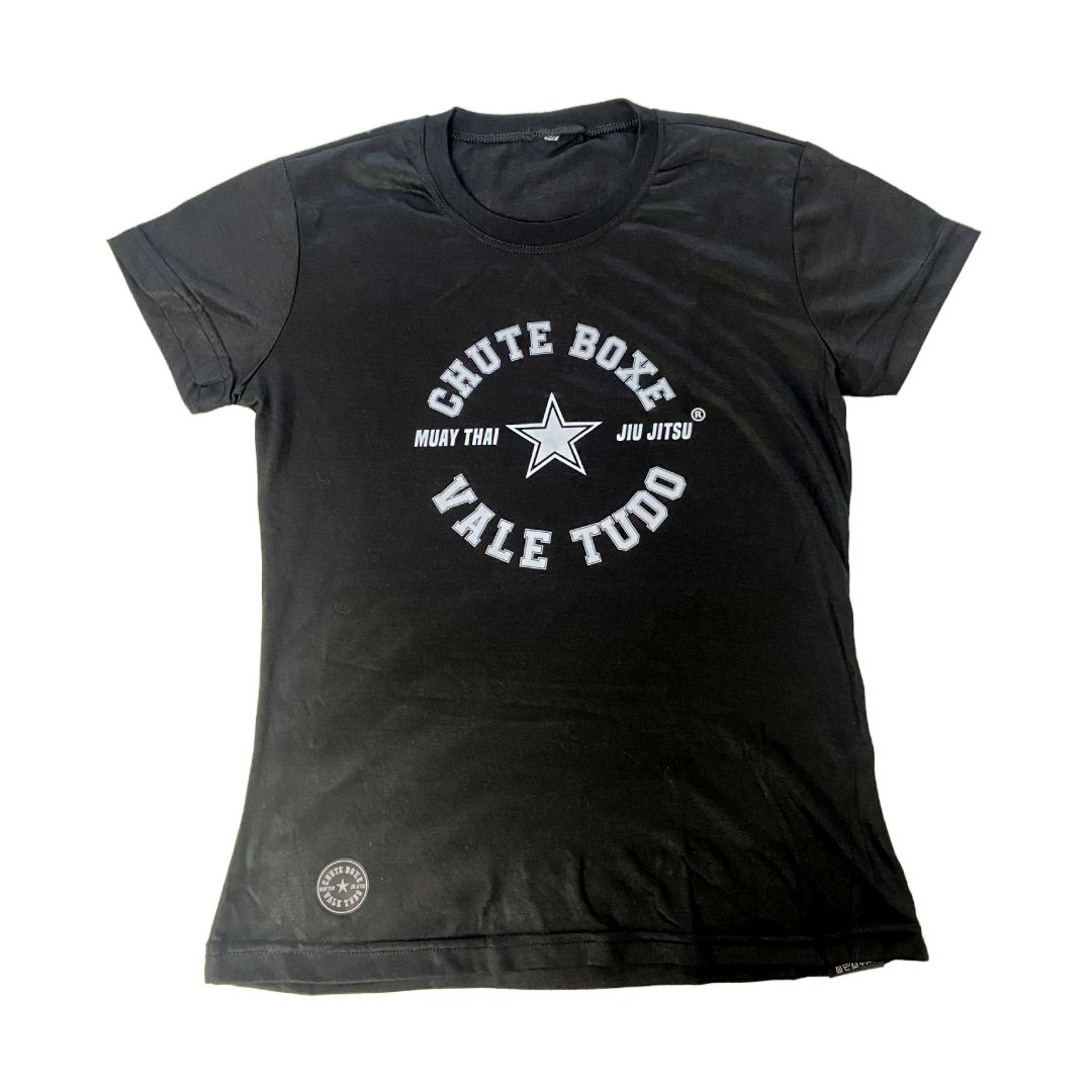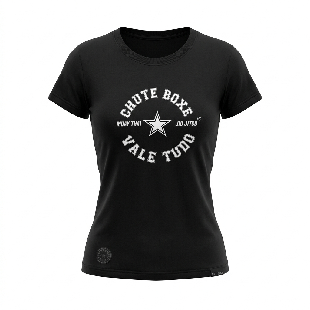 O design frontal apresenta o clássico logo circular com estrela central e a inscrição “Chute Boxe – Muay Thai – Jiu Jitsu – Vale Tudo” em estampa branca de alta definição, criando um contraste forte e marcante sobre o fundo preto.