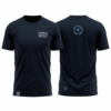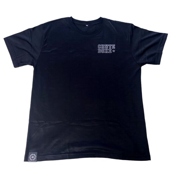 O design frontal apresenta o clássico logo circular com estrela central e a inscrição “Chute Boxe – Muay Thai – Jiu Jitsu – Vale Tudo” em estampa branca de alta definição, criando um contraste forte e marcante sobre o fundo preto.